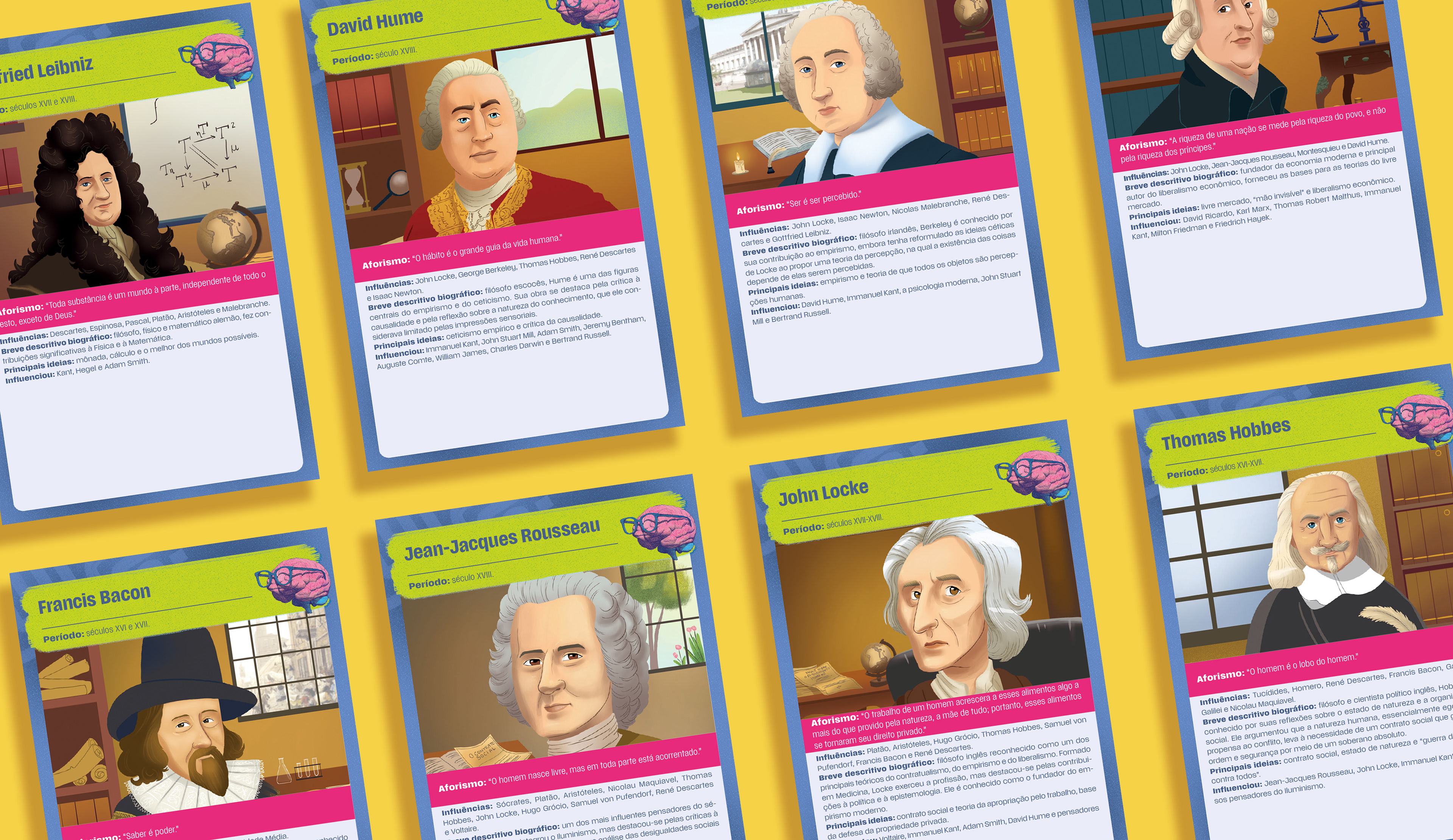 Cada arte ilustra cartas com informações sobre cada personagem.